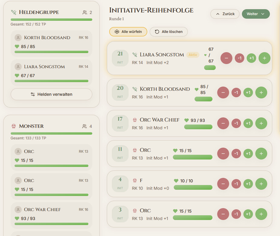 zwischen den Jahren habe ich ein kleines Hobbyprojekt gestartet, welches ich jetzt gerne teilen würde. Ich habe eine kleine Unterstützung für DM´s gebaut um Initiative zu tracken und für die ganze Gruppe um HP zu tracken.