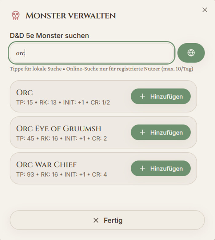 Einfach Monstergruppen anlegen, mit den Standardmonstern hinterlegt und einer Suche für weitere Monster. Es ist möglich mehrere Gruppen anzulegen, sodass man die ganze Session vorbereiten kann